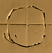 An approximately 5mm x 5mm photomicrograph of lines scribed in a metal surface, and polished with black rouge compound.